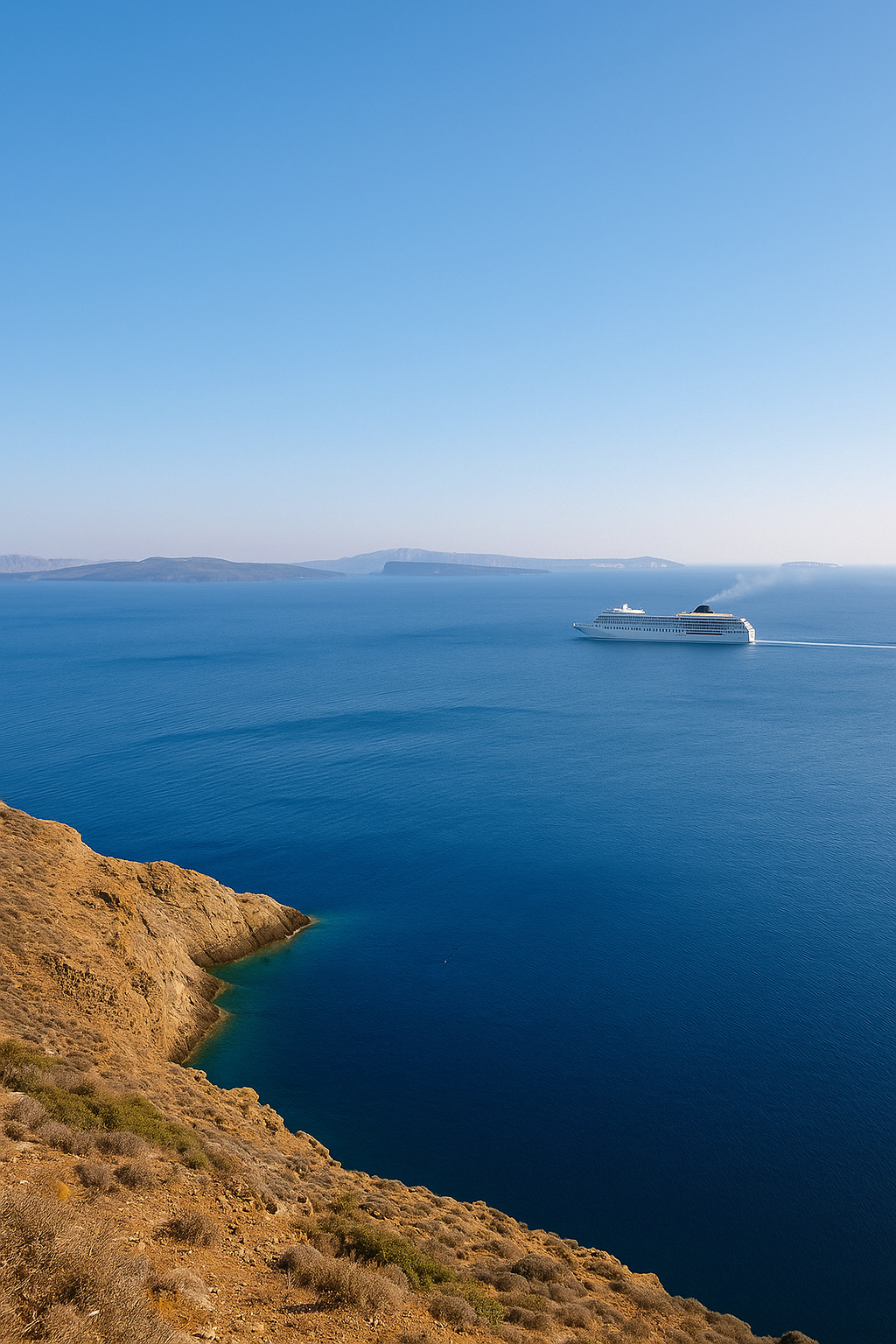 Instale-se na cabine e explore as áreas comuns do navio: decks panorâmicos, piscinas, restaurantes e lounges. Ao entardecer, navegação pelo azul profundo do Egeu, com o horizonte se perdendo em tons dourados e alaranjados. Noite a bordo, embalado pelo balanço suave do mar.