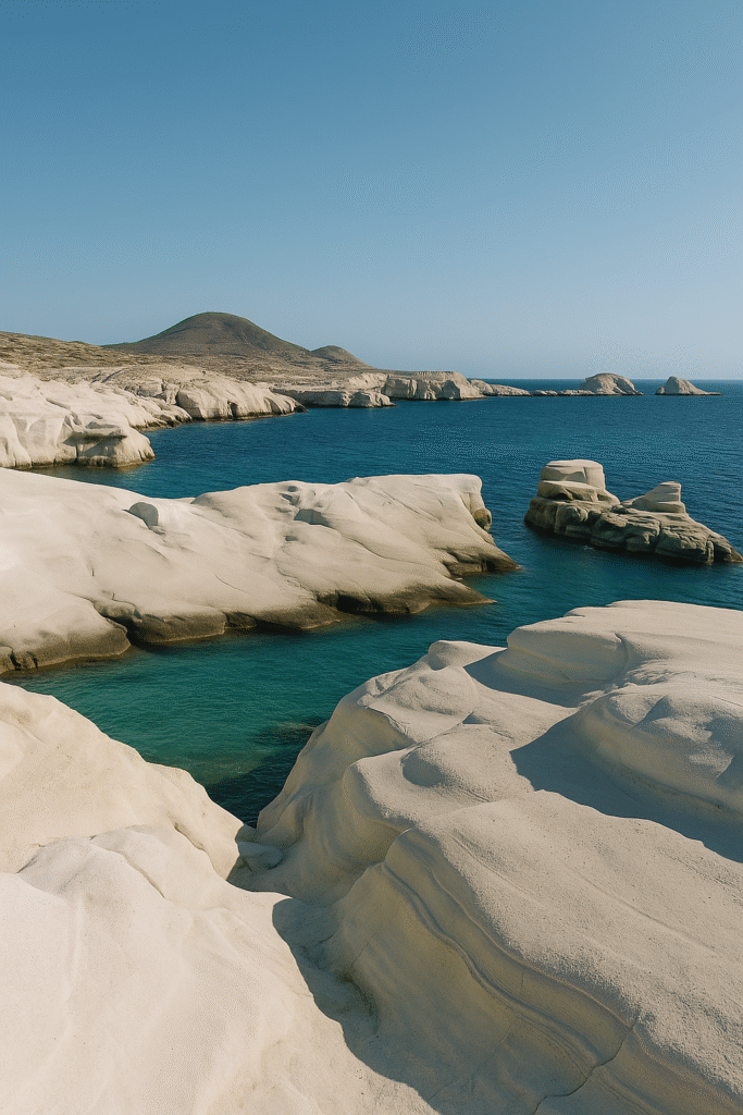 Amanheça em Milos, ilha vulcânica de beleza única e praias que parecem esculpidas por artistas. Famosa pela descoberta da icônica estátua da Vênus de Milo (hoje no Museu do Louvre), a ilha guarda tesouros naturais como Sarakiniko, uma praia de areia branca e formações rochosas que lembram a superfície da lua.
